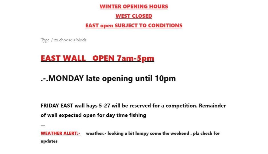 we have a private comp on the EAST WALL Friday daytime from bay 5 to 25 until 4pm. It is hoped if dry too have upper section of wall also open too day anglers.
